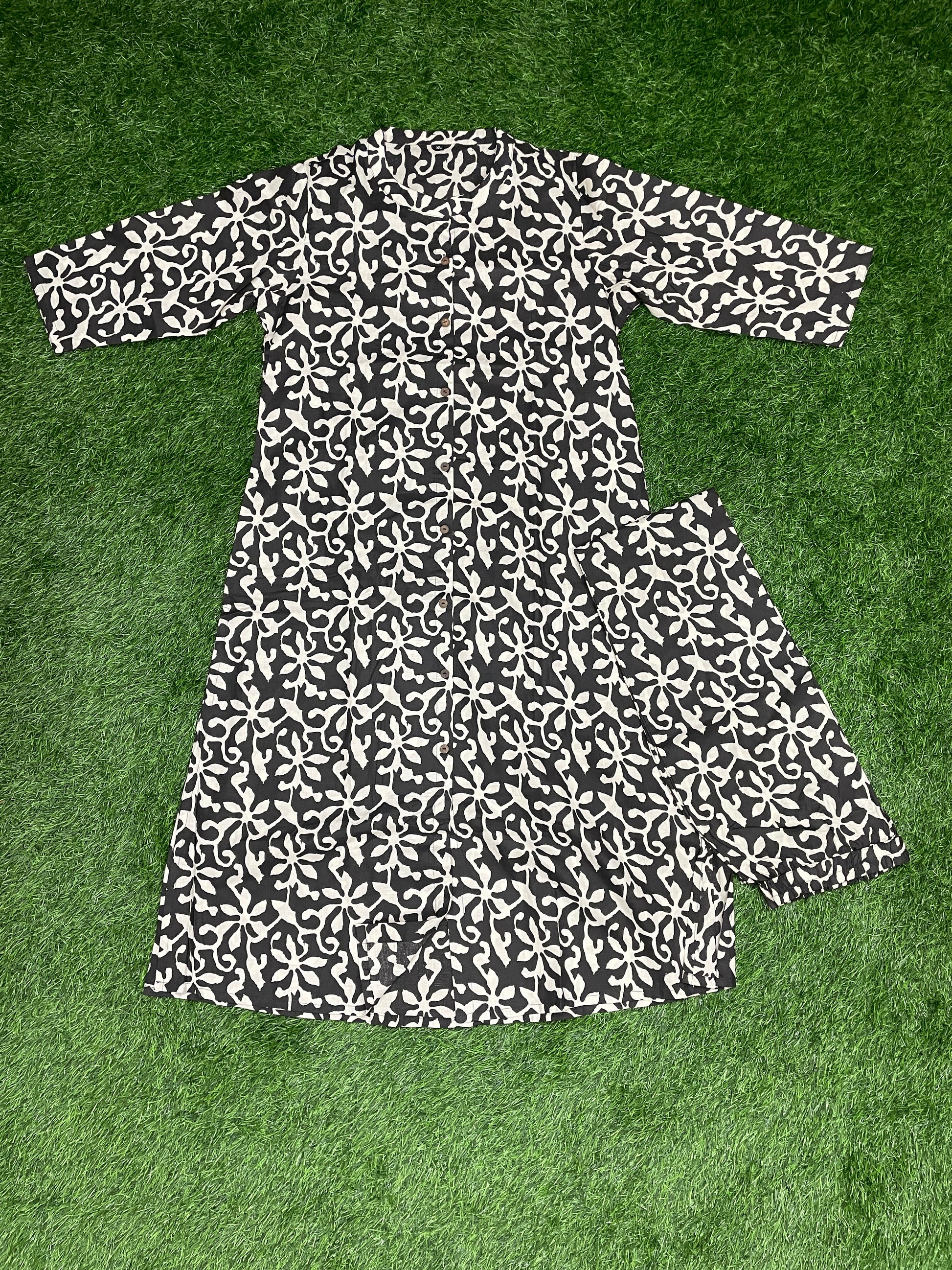 Stay stylish and comfortable in this black & white printed cotton 2-piece set. Featuring a button-down kurta paired with matching bottoms, this set is perfect for daily wear or casual outings. Its breathable cotton fabric ensures all-day comfort while keeping you chic.