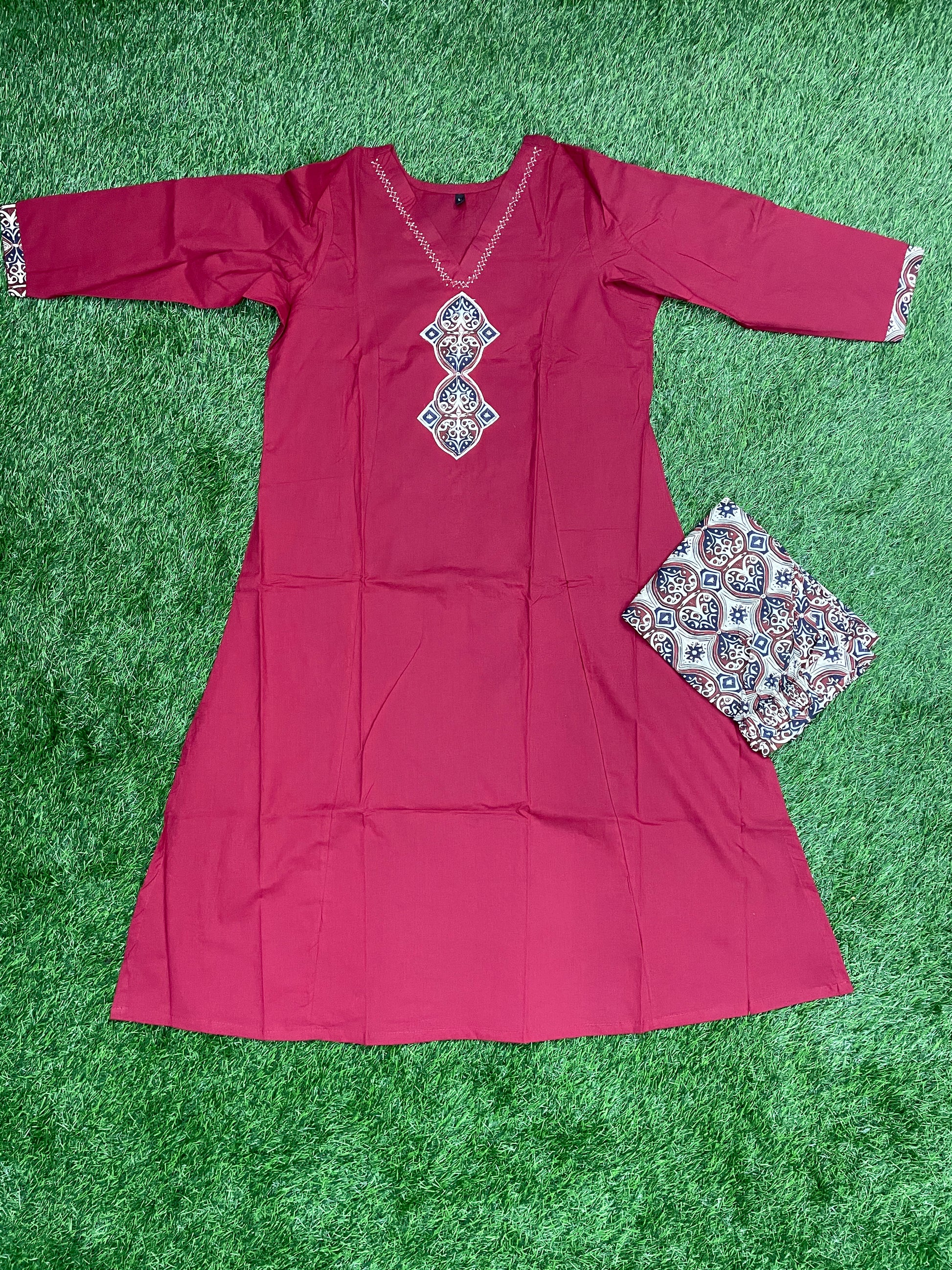 Stay stylish and comfortable with this Cotton Coord Set, crafted in breathable fabric. The maroon top is enhanced with delicate embroidery on the neckline and front, paired with matching printed cotton pants. A perfect blend of comfort and elegance, ideal for daily wear or semi-formal occasions.