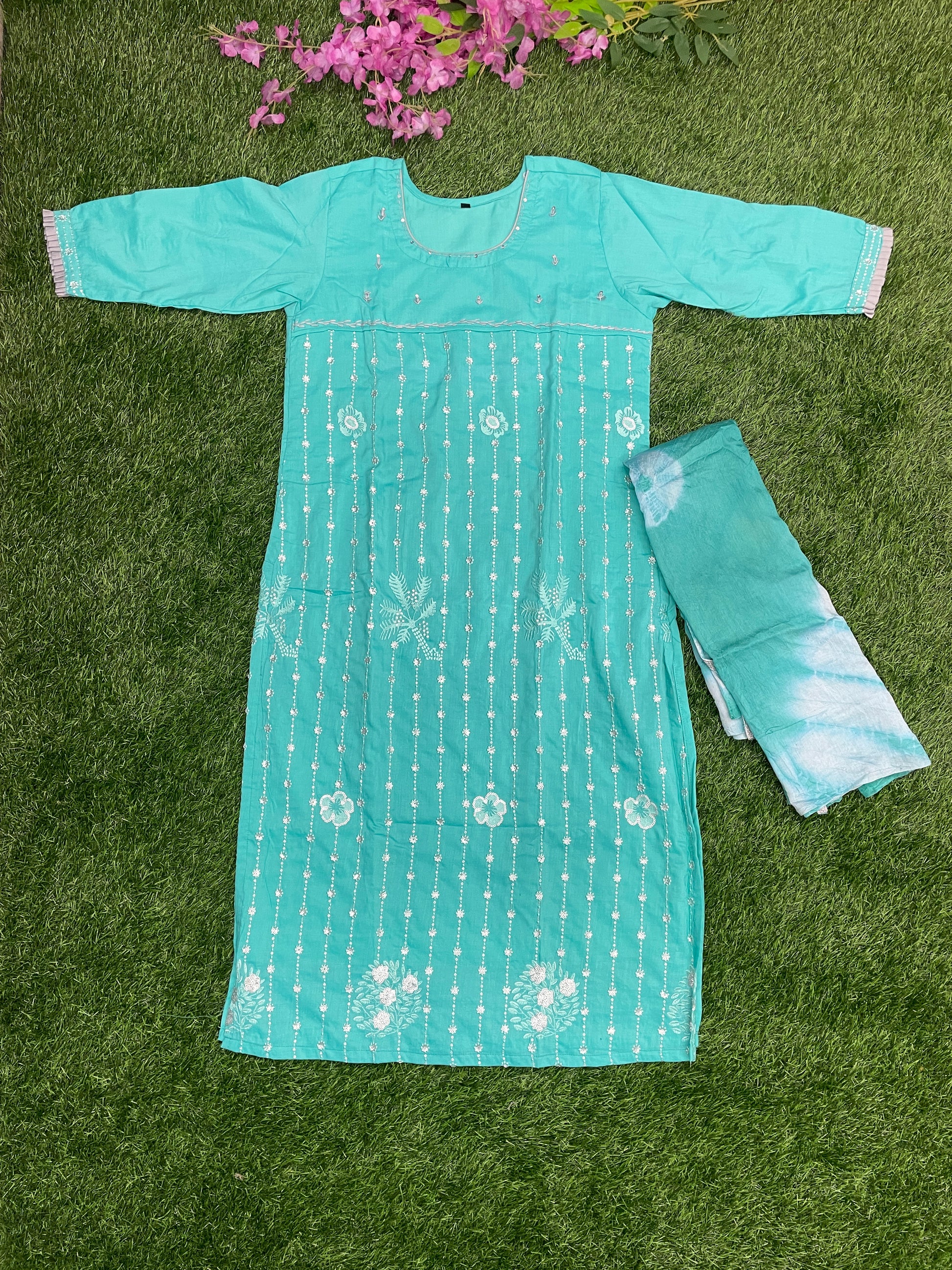 A refreshing turquoise cotton 2-piece set featuring delicate white embroidery patterns. This set includes a comfortable kurti with lining for a perfect fit, paired with a matching dupatta in a soft tie-dye effect. Ideal for daily wear, casual outings, and small gatherings.