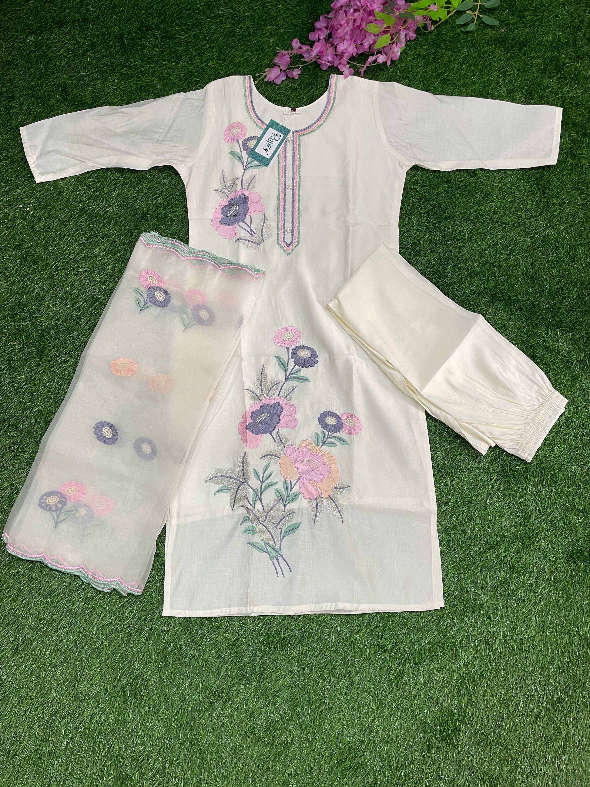 Step into elegance with this party wear kurti set featuring delicate floral appliqué embroidery on a soft white base. The highlight of the outfit is the lightweight organza dupatta with matching floral motifs that adds charm and sophistication. Designed for festive gatherings, celebrations, and parties, this set is both stylish and comfortable.
