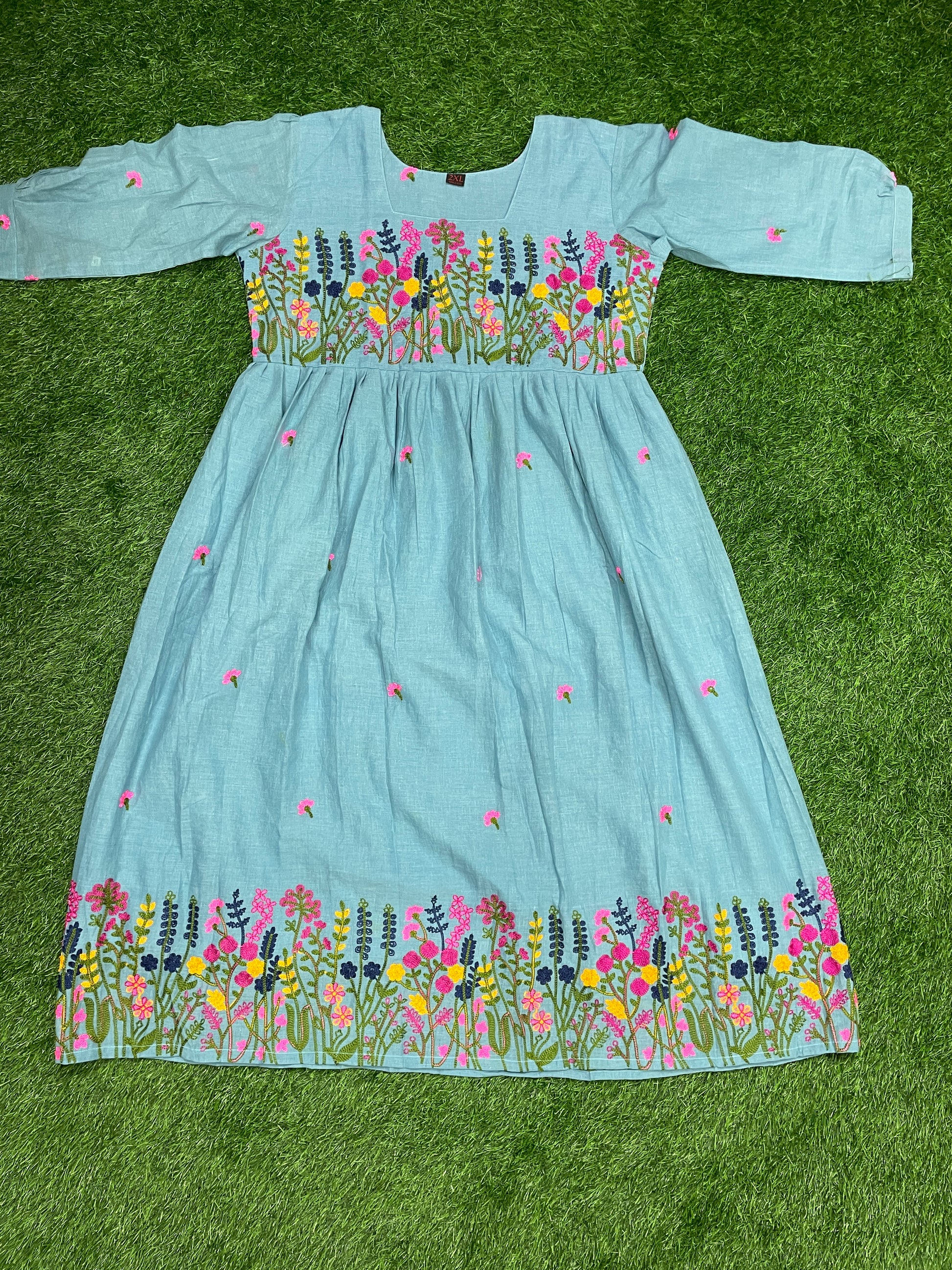 - Colour: Sky Blue base with multicolour floral embroidery (yellow, pink, green, navy)