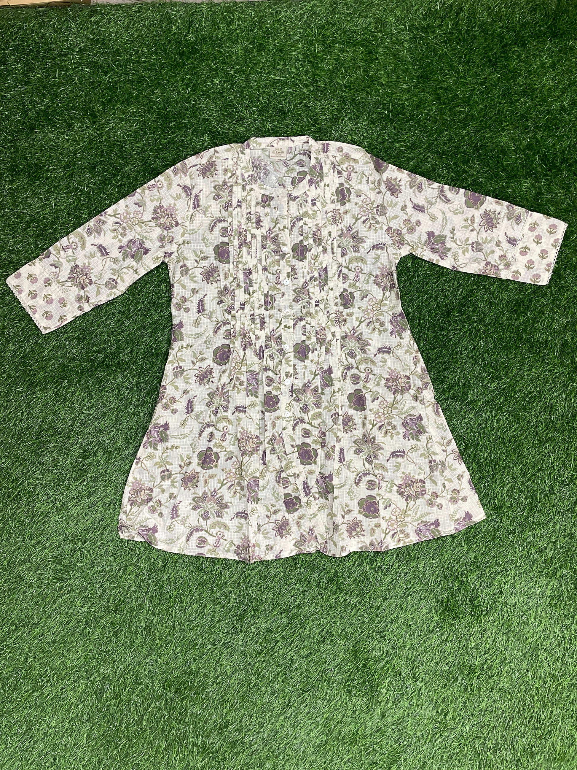 - Color: White base with Lavender & Green Floral Print